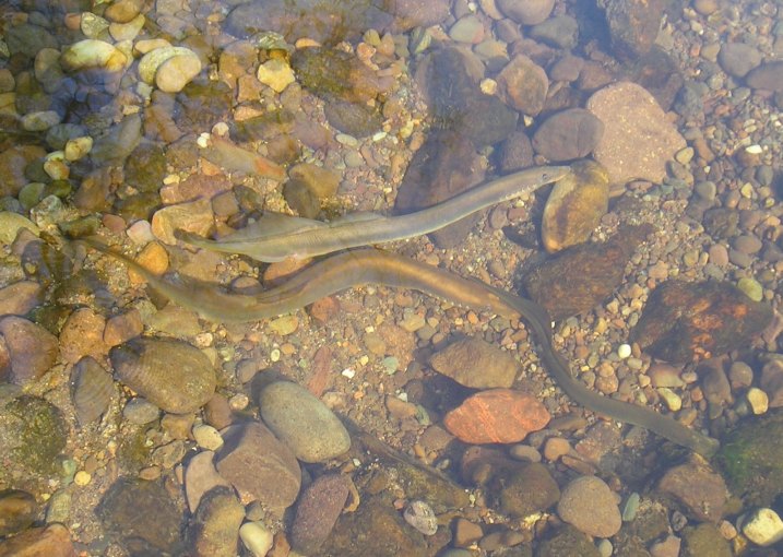 I think that these were River Lampreys preparing to spawn; they were remarkable muck-shifters moving pebbles that must have been at least 50% of their own weight with apparent ease.