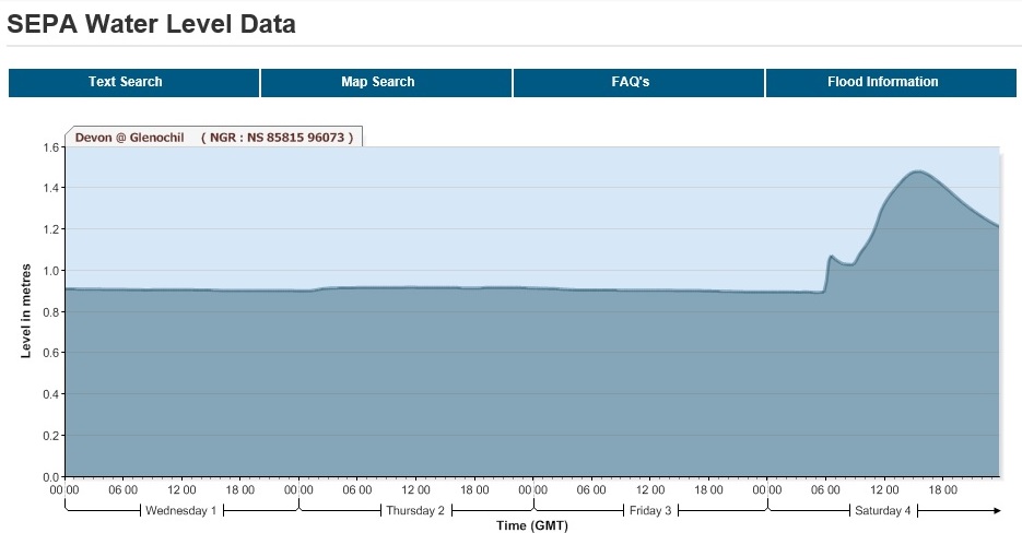 Unfortunately in these conditions this means the upper parts of the river don’t get the benefit of a decent flush, that the river gets below the Cauldron Linn. This is illustrated when you see the impact of Friday nights deluge on the two Sepa river gauges:
