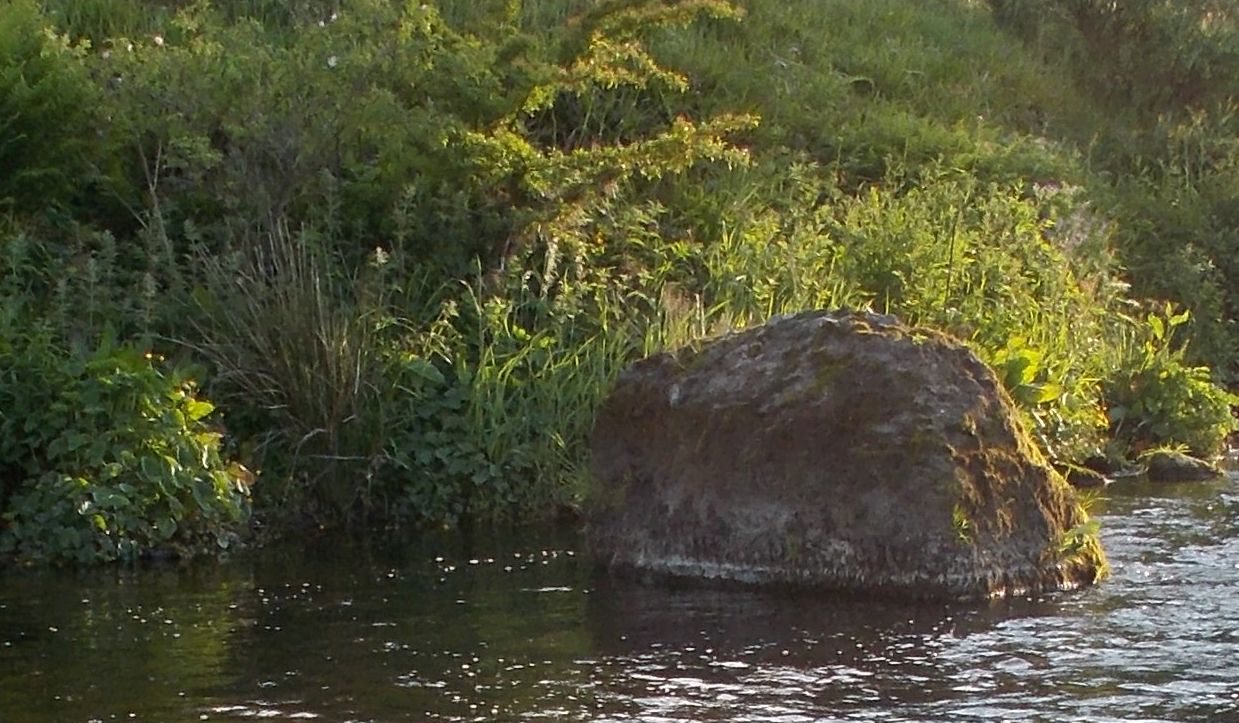 The impoundment of the Devon in Glendevon, has many negative impacts on the river not least removing for much of the year the variations in flow which is vital for the eco-systems of a river. In a prolonged dry spell however it is a blessing as it provides a steady flow with the minimum permitted released volume. By late June, on the Fossoway section of the river, the impact of the prolonged draw down in groundwater levels and the reduction of flow from the only significant tributary below the dam (the Glendey Burn) can be see in the tide mark on this boulder:
