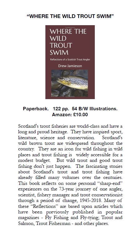 Some of our members may be familiar with DAA member Drew Jamieson from encounters with him on the Devon or from reading some of his work in the likes of The Scotsman (where he has been their angling correspondent), Trout and Salmon, Fly Fishing and Fly Tying, Trout Fisherman and the Atlantic Salmon Journal. He was responsible for an extremely professional rebuttal of CEMEX proposal for sand & gravel extraction in Glenquey which helped inform the refusal of planning permission by Perth & Kinross Council. From 1979 until 2000 he was responsible for the trout reservoirs of Lothian Regional Council and the fisheries of East of Scotland Water, across the south and east of Scotland. He has also served on the Secretary of State’s Consultative Committee of Freshwater Fisheries, been Honorary Secretary of the Scottish Angler’s National Association (SANA) and a Fellow of the Institute of Fisheries Management (of which he was chair of the Scottish Branch for a number of years.)