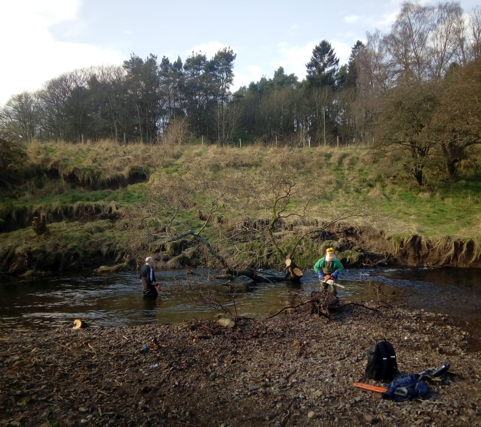 Clearing falling lumber from the Devon at the Haugh
