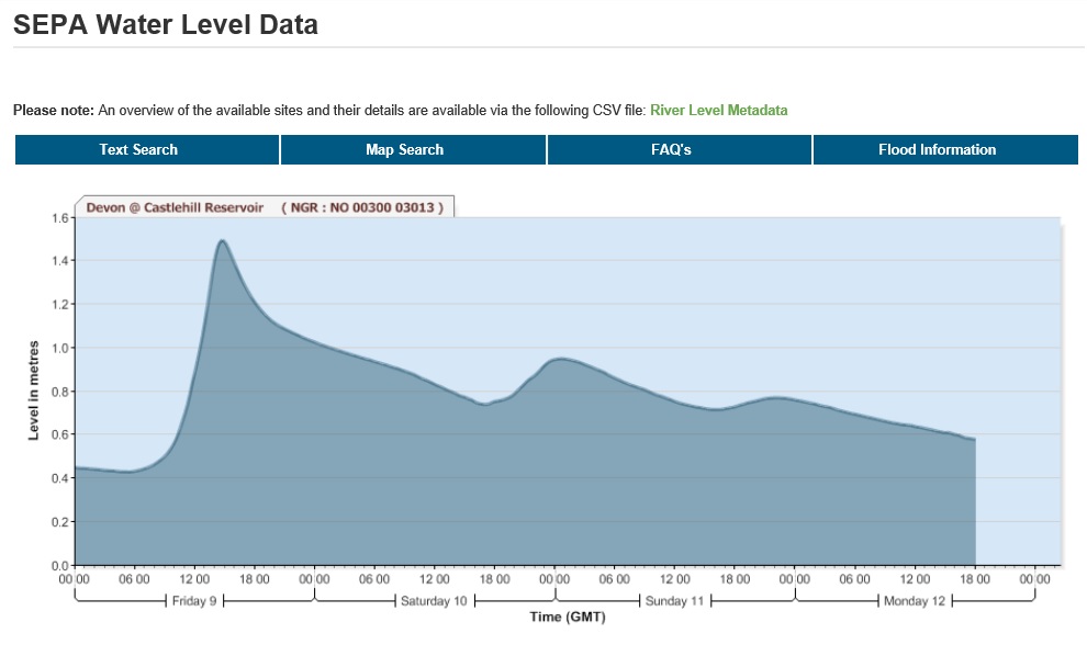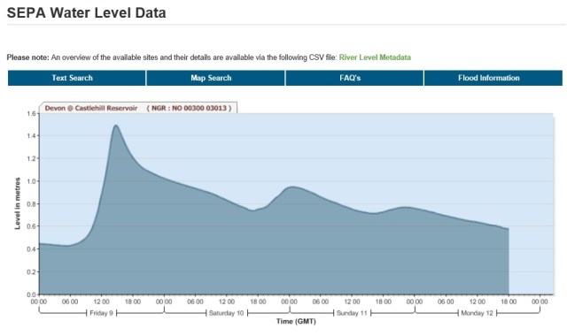 After a series of minor spate events caused very heavy localised cloud bursts during last week the heavens really opened on Friday. In no time, the Devon at Castlehill reservoir had risen over a metre: