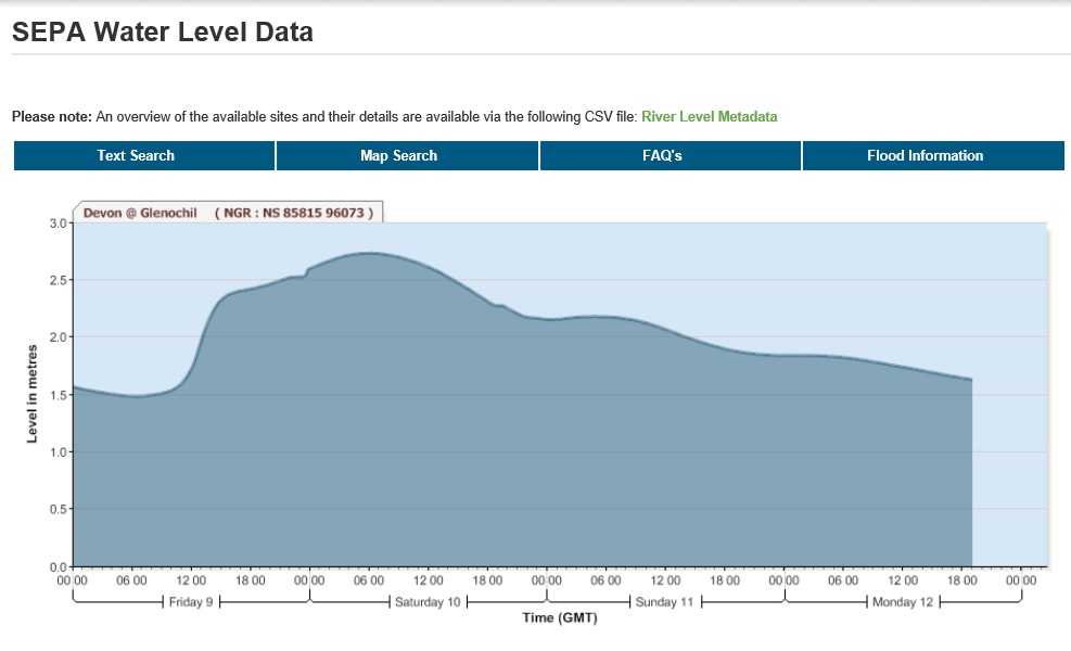 As is its fashion the gauge at Glenochil showed a much slower rise but peaking with extra 1.25m of flow: