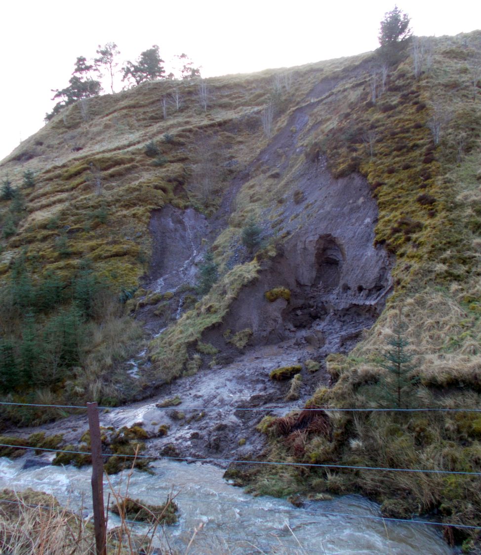 There is little that can be done here, this is an entirely natural phenomenon as the valley here is geologically a very young valley and the burn is busy eroding the valley sides until one day, in centuries to come, there will be a stable V-shaped valley. The positive impact is that it will encourage fresh sand and gravel to be moved downstream.