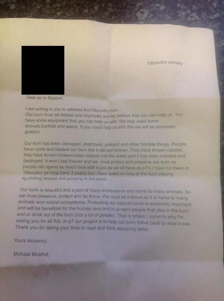 This rather splendid letter plea for care for the Tillycoultry Burn has been circulated by Micheal Mcelhill, a P7 pupil at Tillicoultry Primary School